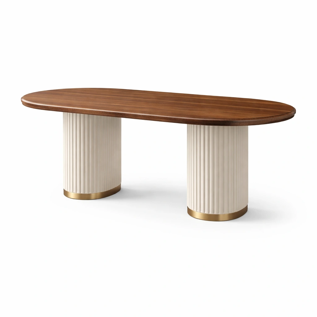 Tavolo da pranzo ovale in legno con basi cilindriche in metallo dorato