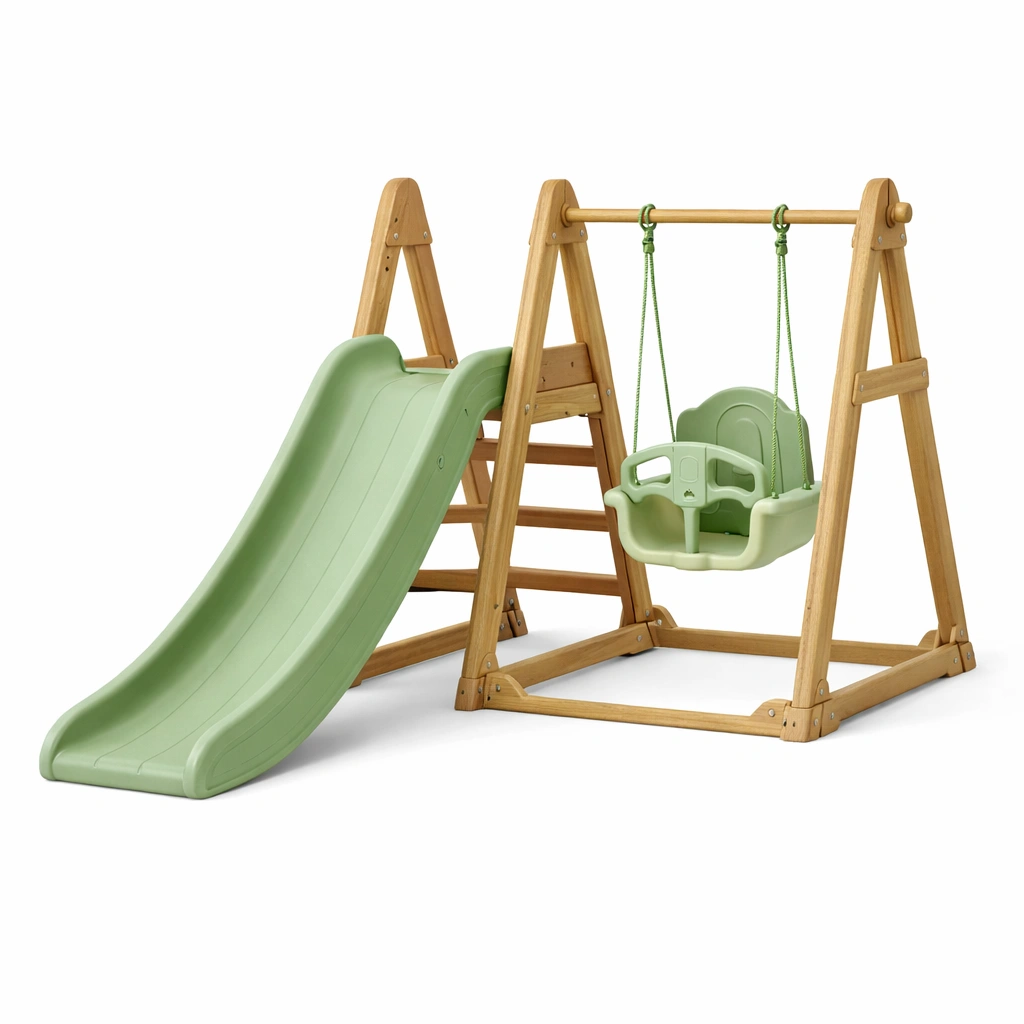 Attrezzatura da gioco per bambini in legno di pino e polietilene verde con altalena e scivolo