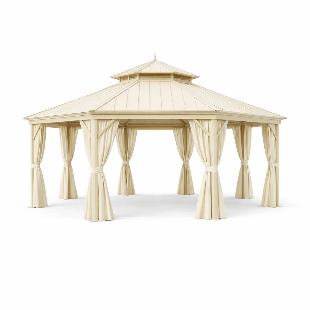 Gazebo esagonale in metallo con tenda in poliestere beige