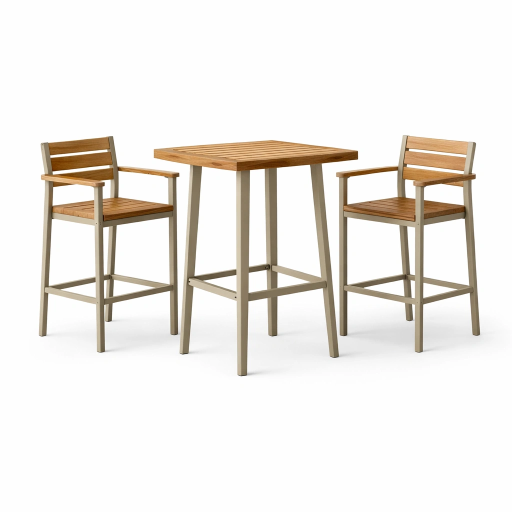 Il set include un tavolo e due sgabelli in legno di teak e struttura in acciaio verniciato. Progettato per uso esterno.
